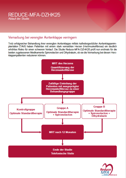 Die Reduce-MFA-DZHK-25-Studie ist eine prospektive, randomisierte, kontrollierte, offene, multizentrische Parallelgruppenstudie mit verblindeter Outcome-Analyse, in der die antifibrotische Wirksamkeit der Medikamente Spironolacton und Dihydralazin bei Patient*Innen mit Aortenstenose und ausgeprägter Myokardfibrose, die einen kathetergestützten Aortenklappenersatz erhalten, mittels MRT untersucht wird.